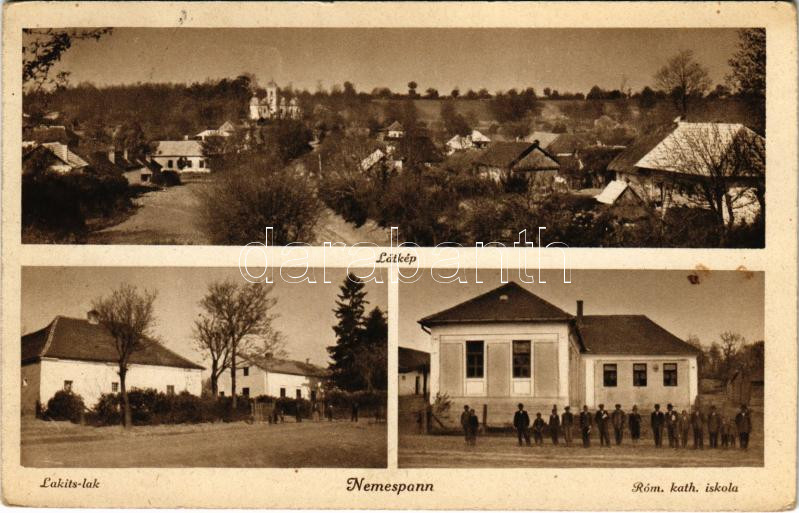 Leírás: 1943 Nemespann, Pana (Nyitra, Nitra); látkép, Lakits lak, Római katolikus iskola. Fogyasztási szövetkezet kiadása / general view, villa, Catholic school (fl)