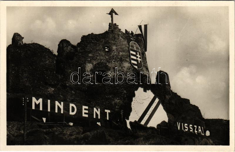 Fülek, Filakovo; várrom "Mindent vissza" irredenta felirattal, Nagymagyarország és magyar zászló, címer. Fenyves Andor kiadása / castle ruins with irredenta motive, Hungarian flag and coat of arms