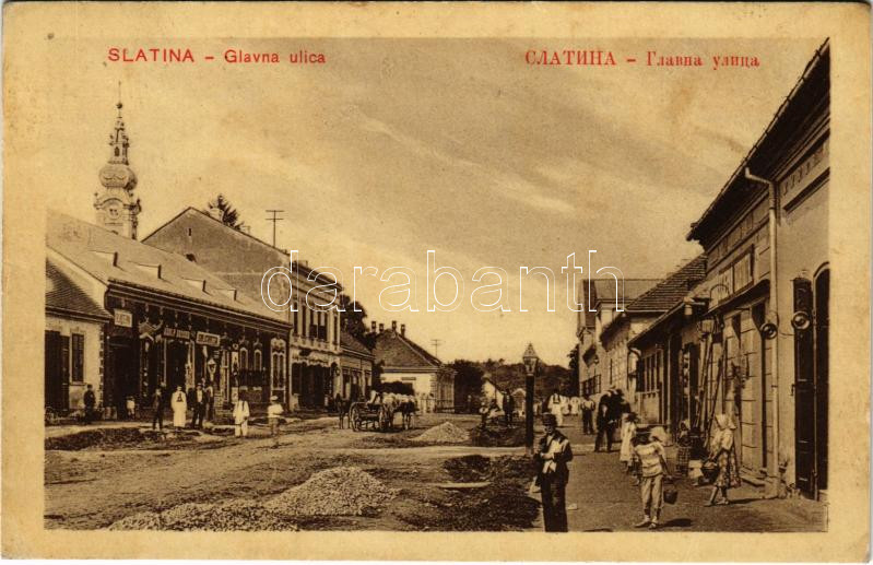 Leírás: Szlatina, Slatina; Glavna ulica / Fő utca, üzletek. Danila M. Hrnjaka kiadása / main street, shops (EK)