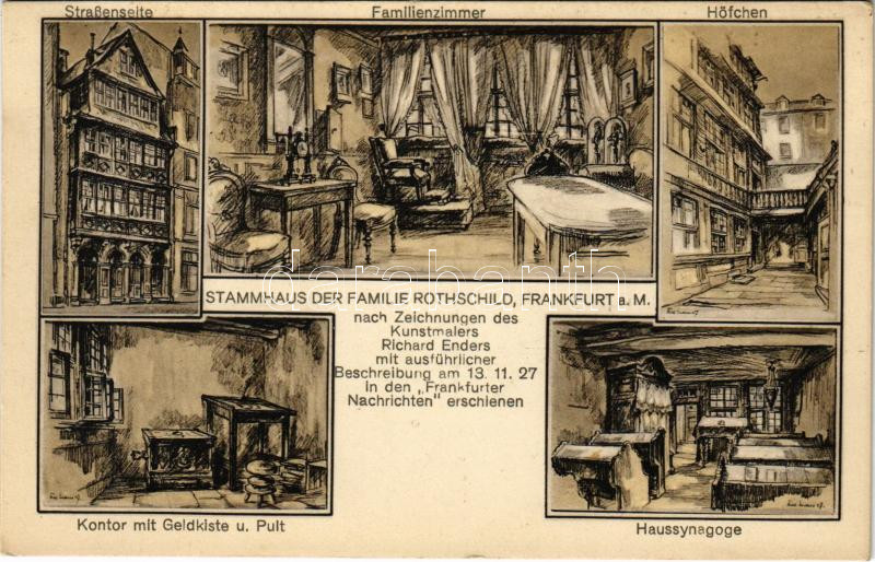 Frankfurt, Stammhaus der Familie Rothschild. Straßenseite, Familienzimmer, Höfchen, Kontor mit Geldkiste u. Pult, Haussynagoge / main house of the Rothschild family, street side, family room, courtyard, office with money box and desk, house synagogue. Judaica s: Richard Enders