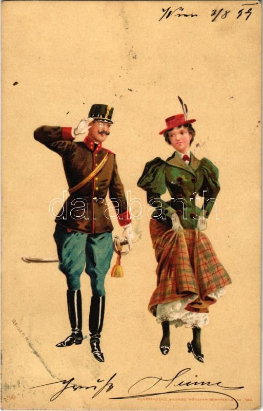 Leírás: 1899 (Vorläufer) Magyar katonatiszt és hölgy / Hungarian military officer. litho s: Geiger R.