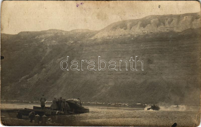 1918 Zaleszczyki (Galicia), osztrák-magyar katonák két motorcsónakot próbálnak a Dnyeszter folyón áttolni / WWI K.u.k. military motor boats pulled by soldiers across Dnister River (Galizien). photo (fl)