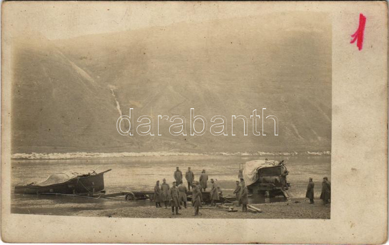 1918 Zaleszczyki (Galicia), osztrák-magyar katonák két motorcsónakot próbálnak a Dnyeszter folyón áttolni / WWI K.u.k. military motor boats pulled by soldiers across Dnister River (Galizien). photo (fl)
