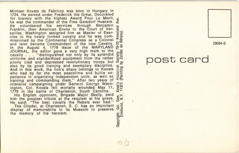 Fabriczi Kováts Mihály (1724-1779), magyar katonai parancsnok és nemes, az amerikai függetlenségi háborúban huszárezredes. Lengyel barátjával, Kazimierz Pulaskival együtt az "amerikai lovasság atyjának" nevezik / Founding Father of the US Cavalry Col. Com. Michael Kovats de Fabriczy. American Bicentennial - 200 Years of Freedom (1776-1976) Copyright Col. Com. Kovats Historical Society s: Zoltán de Bényey - MODERN