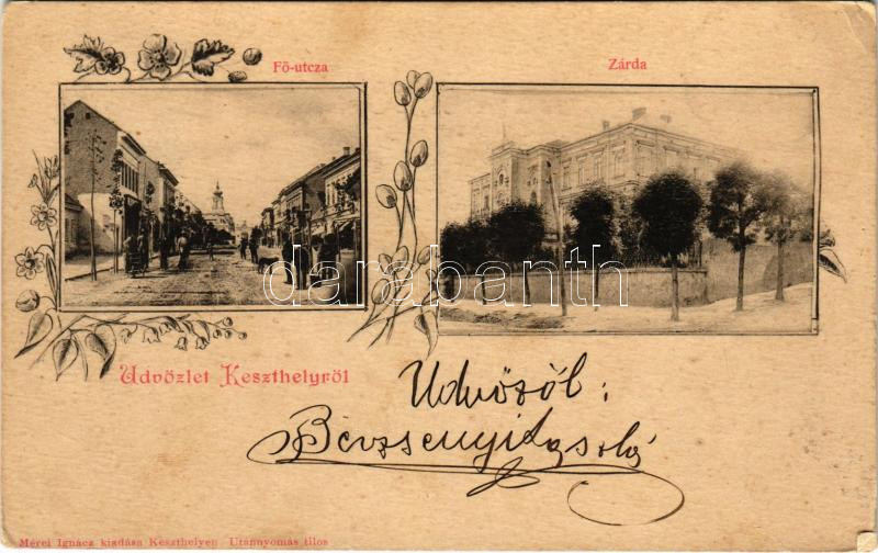 Leírás: 1899 (Vorläufer) Keszthely, Fő utca, zárda. Mérei Ignác kiadása, Art Nouveau, floral (EK)
