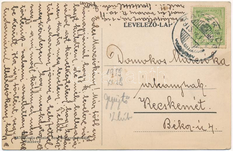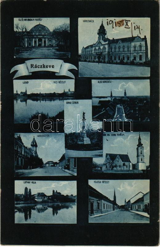 1915 Ráckeve, Cs. és kir. uradalmi kastély, Városháza, látkép, vízi részlet, alsó városrész, Árpád szobor, Városház tér, Görögkeleti szerb (ortodox) templom, Lipthay villa, Fő utcai részlet. Münich Jenő kiadása (EK)