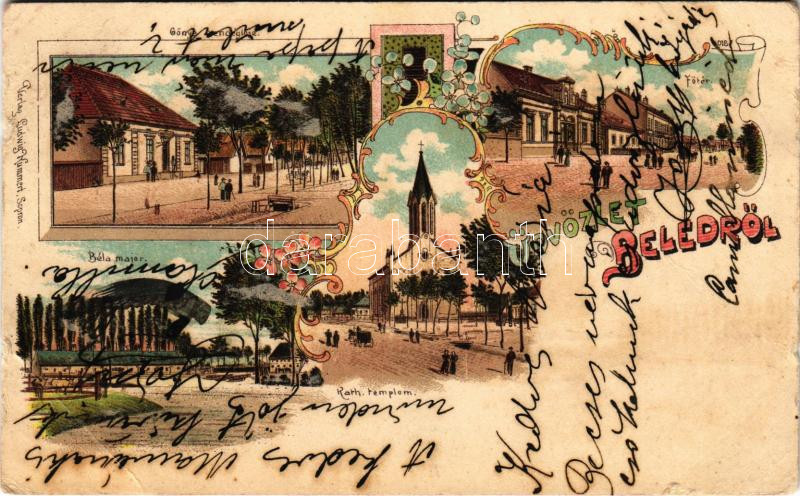 Leírás: Beled (Kapuvár), Gönye vendéglője, étterem, Fő tér, Béla major, Római katolikus templom. Ludwig Kummert 4018. Art Nouveau, floral, litho (EB)