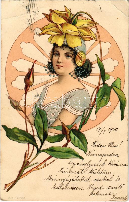 1900 Art Nouveau lady, floral, litho (EB) https://www.darabanth.com/hu/464-Gyorsarveres/464.0/Kepeslapok/Muveszlapok~2000065/1900-Art-Nouveau-lady-floral-litho-EB~II3129021