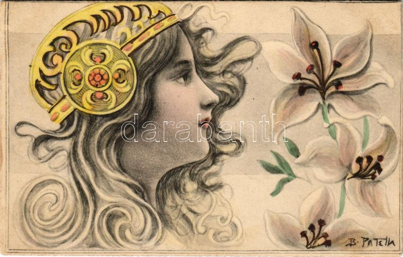 Art Nouveau lady, floral s: B. Patella https://www.darabanth.com/hu/464-Gyorsarveres/464.0/Kepeslapok/Muveszlapok~2000065/Art-Nouveau-lady-floral-s-B-Patella~II3129007