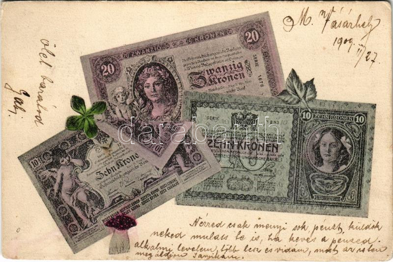 1909 Húsz és tíz koronás magyar bankjegy. Szecessziós montázs újévi motívumokkal / Hungarian banknote montage with mushrooms and horseshoes, clover, New Year (EK)