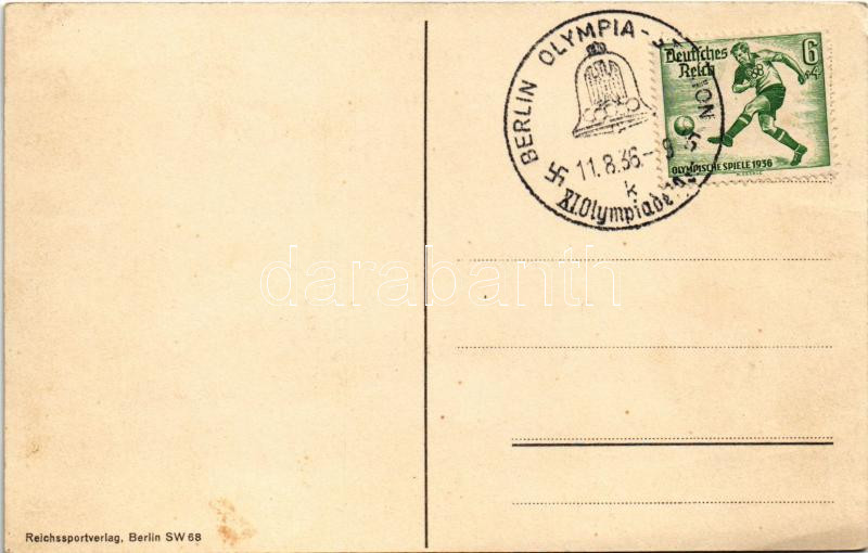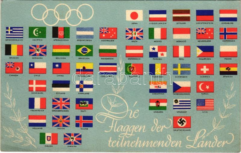 1936 Olympiajahr, Die Flaggen der teilnehmenden Länder. Reichssportverlag / 1936 Summer Olympics, flags of the participating countries, Flag of Nazi Germany with swastika / 1936. évi nyári olimpiai játékok résztvevő országainak a zászlói, a nemzetiszocialista Németország zászlaja horogkereszttel + "BERLIN OLYMPIA-STADION XI. OLYMPIADE 1936" So. Stpl. (EK)
