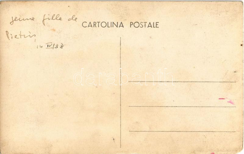 Leírás: 1938 Pietris, Romanian folklore, spinning woman. photo (surface damage)