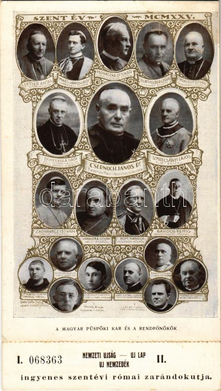A Magyar Püspöki Kar és a rendfőnökök; Dr. Csernoch János bíboros-hercegprímás, Prohászka Ottokár püspök, Zichy Gyula gróf, Szmrecsányi Lajos érsek, Zadravecz István tábori püspök, stb. Az 1925-ös Szent év alkalmából kiadott képeslap; hátoldalon Nemzeti Újság reklám + Szelvény az ingyenes szentévi római zarándokútra / Hungarian Catholic Bishops' Conference + coupon (ázott sarok / wet corner)