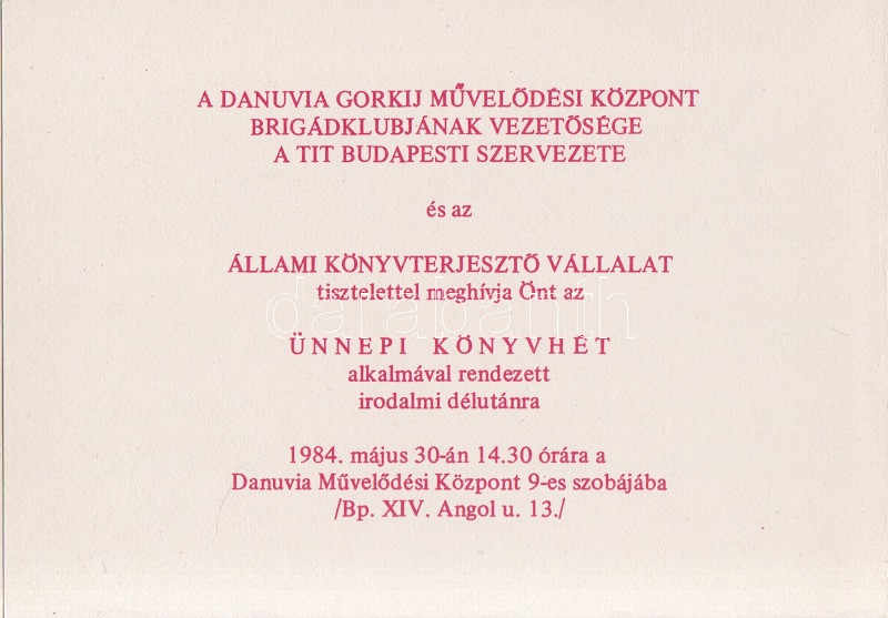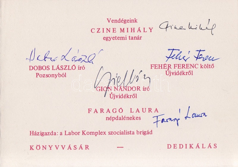 Fehér Ferenc: Szeptemberi útravaló. Második, bővített kiadás. Újvidék, 1983. Forum Könyvkiadó (ny.) 144 + [8] p. Dedikált: ,,Molnár János drága barátomnak és Erzsinek, újabb útravalóként - remélt utainkhoz... Szeretettel: Fehér Ferenc. Kecskemét, 1984. máj. 24." A kötet valamennyi oldala illusztrált. Prov.: Molnár János. [Molnár János kecskeméti népművészeti gyűjtő, a kecskeméti Katona József Társaság vezetőségi tagja, számos író és költő erdélyi útikalauza.] Színes, illusztrált kiadói kartonkötésben. Jó példány. Hozzá tartozik: [Alkalmi nyomtatvány] Meghívó az 1984. évi Ünnepi Könyvhét alkalmából rendezett irodalmi délutánra, Czine Mihály irodalomtörténész, Dobos László pozsonyi író, Fehér Ferenc újvidéki költő és Gion Nándor újvidéki író és Faragó Laura népdalénekes saját kezű aláírásával. Kelt: Budapest, 1984. május. Egyetlen levél, hajtogatva, mérete: 105x300 mm, 29 nyomtatott sor. A könyvvásárral és dedikálással egybekötött irodalmi délutánt a Danuvia Gorkij Művelődési Központ Brigádklubja, a TIT Budapesti Szervezete és az Állami Könyvterjesztő Vállalat szervezte 1984. május 30-én, 14.30 órától. Házigazda: a Labor Komplex szocialista brigád. Tökéletes állapotú lap.