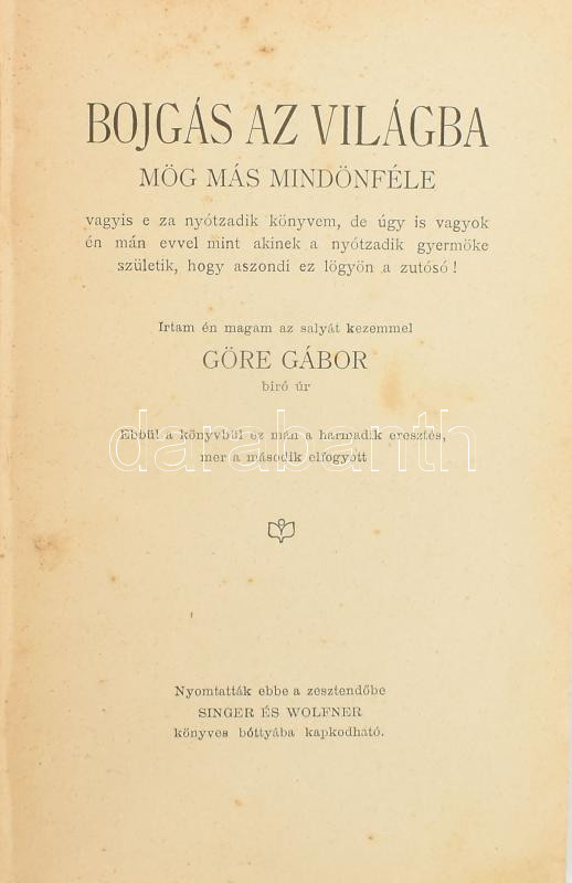Gárdonyi Géza: Göre Gábor: Bojgás az világba. Mög más mindönféle. Bp.,(1914), Singer és Wolfner, 155+5. Harmadik eresztés. Átkötött félvászon-kötés, kissé foxing foltos lapokkal.