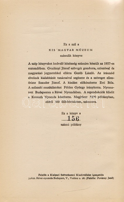 (Budapest), 1957. Magyar Helikon (Révai-ny.) 222 + [2] p.