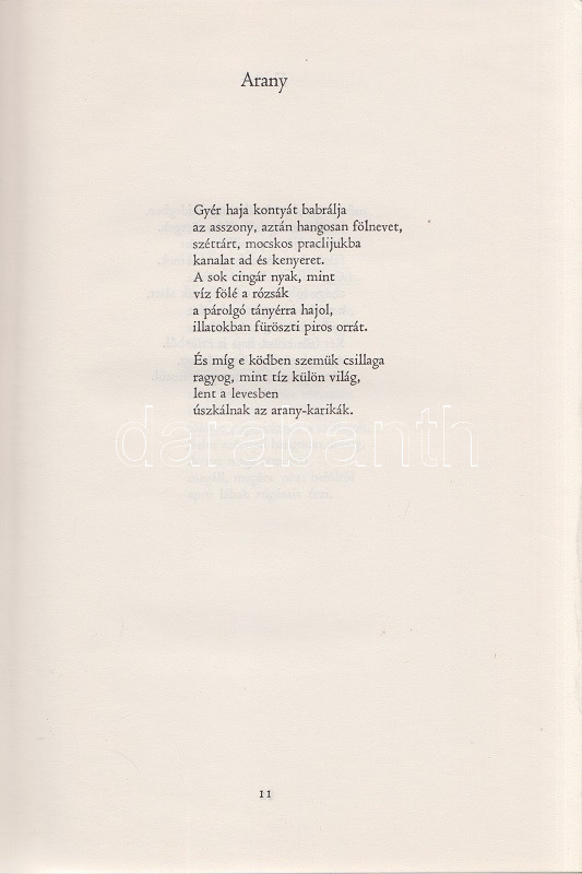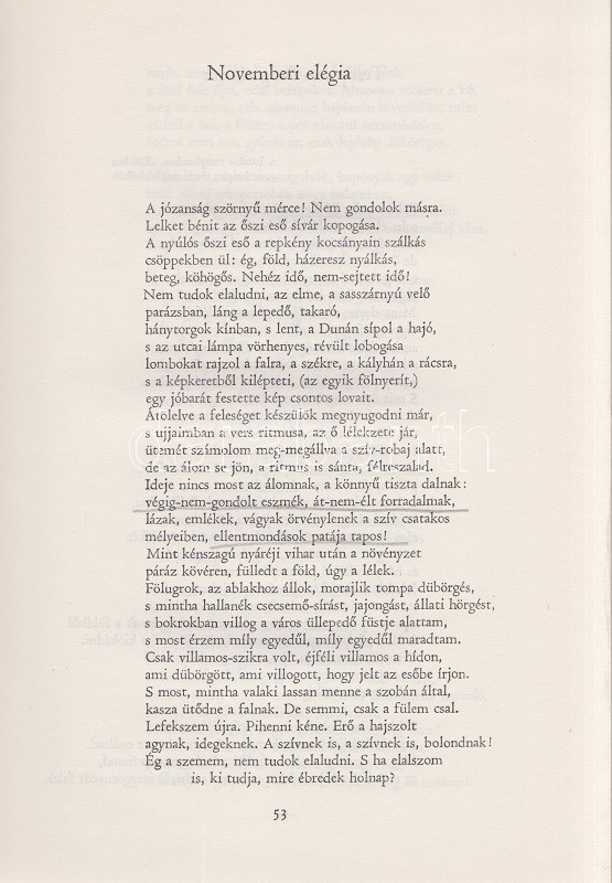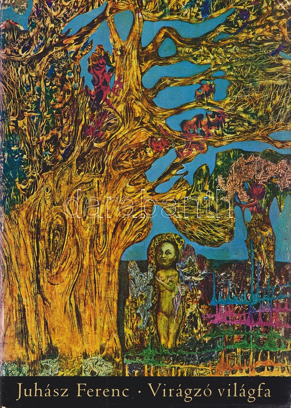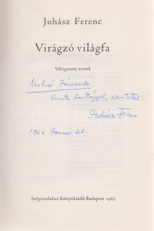 Juhász Ferenc: Virágzó világfa. Válogatott versek. Budapest, 1965. Szépirodalmi Könyvkiadó (Kossuth ny.) 1 t. (címképen a szerző egészalakos portréja) + 416 + [4] p. Egyetlen kiadás. Dedikált: ,,Molnár Jánosnak őszinte barátsággal, szeretettel: Juhász Ferenc. 1966 január 28." A kötetben néhány aláhúzás és kritikai megjegyzés: minden bizonnyal a possessor, Molnár János keze írása; az aláhúzások jól kiemelik a költő szövegeinek feltűnően kínos helyeit. A költő fényképe Vattay Elemér munkája. Tezla 4391. Poss.: Molnár János. [Molnár János helytörténész, kecskeméti népművészeti és könyvgyűjtő, a kecskeméti Katona József Társaság vezetőségi tagja, számos magyar író, költő erdélyi úti kalauza, számos erdélyi költő, író kecskeméti házigazdája az 1960-1980-as években.] Aranyozott gerincű, kiadói egészvászon kötésben, Hantai Simon által illusztrált, színes, kiadói védőborítóban. Jó példány.
