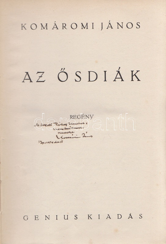 Dedikált: ,,Az öregebb Ráskay Karcsinak, kedves barátomnak, szeretettel: Komáromi János. Bp. 1929. dec. 11".