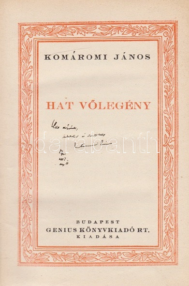 A címoldalon az író ismeretlen személynek címzett dedikálása, Budapest, 1932. aug 13-i helyszínnel és dátummal. A regény első kiadása 1927-ben jelent meg.