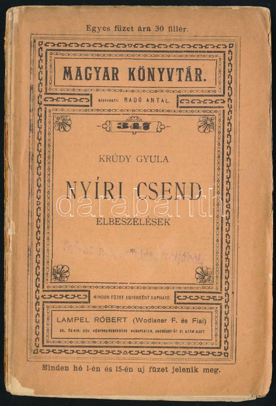 Krúdy Gyula: Nyíri csend. Elbeszélések. Magyar Könyvtár. Bp., (1903), Lampel R. (Wodianer F. és Fiai), 74 p. Első kiadás. Kiadói papírkötés, szakadt borítóval.