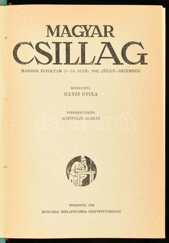 Magyar Csillag II. évfolyamának (1942) 3, 4, 5, 7, , 9, 11, 12, 13. száma. 8 db szám egybekötve. A Magyar Csillag (1941. október 1. -- 1944. április 1.) irodalmi és kritikai folyóirat, a Nyugat utódja a második világháború alatt. A számokban többek között : Illyés Gyula , Radnóti Miklós, Németh László , Tamási Áron, Karinthy Gábor , Kálnoky László, Szabó Lőrinc, Márai sándor és Weöres Sándor és Berda József első közlésű műveivel. Jellegtelen félvászon kötésben, jó állapotban.