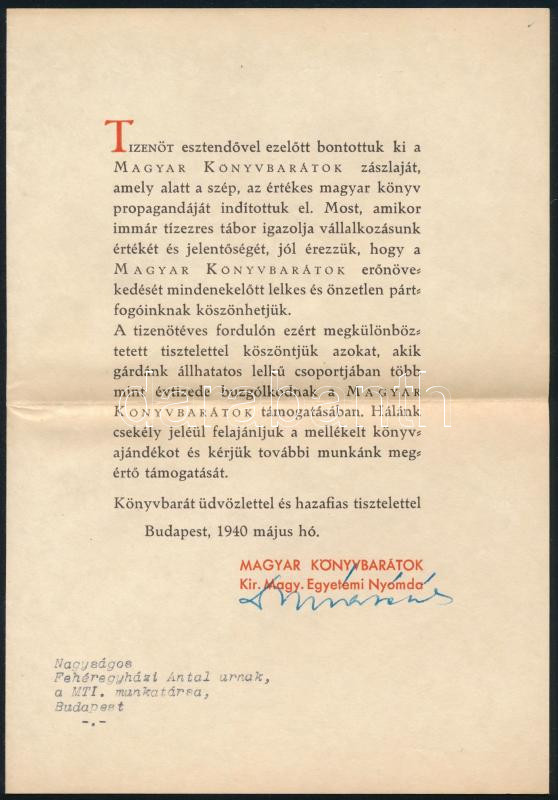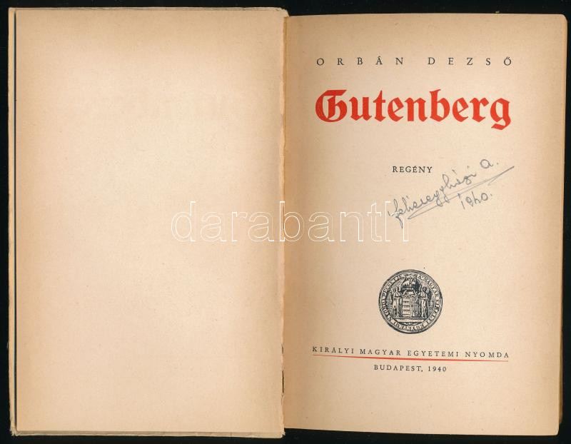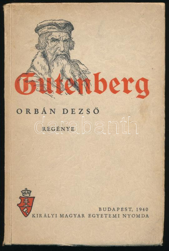 Orbán Dezső: Gutenberg. Bp.,1940, Kir. M. Magyar Egyetemi Nyomda. Kiadói papírkötés. Benn a Magyar Könyvbarátok tizenöt éves fennállása alkalmából íródott köszönő formanyomtatvány-levéllel "gárdánk állhatatos lelkű csoportjában több mint évtizede buzgólkodnak a Magyar Könyvbarátok támogatásában", MTI belső munkatársa, Fehéregyházi Antal részére.