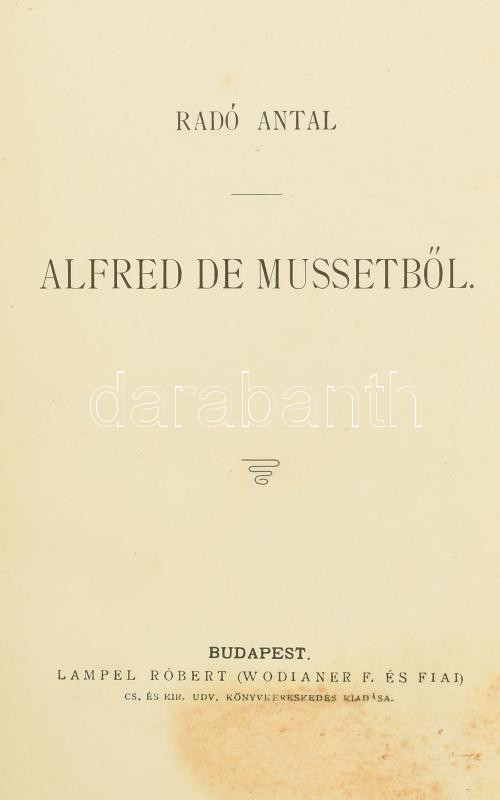 Radó Antal: Alfred de Mussetből. Bp., é.n., Lampel Róbert (Wodianer F és Fiai). Kiadói aranyozott egészvászon-kötésben, aranyozott lapélekkel, előzéklapon ajándékozási bejegyzéssel, foltos címképpel és címlappal, néhány kevés lap kissé foltos.