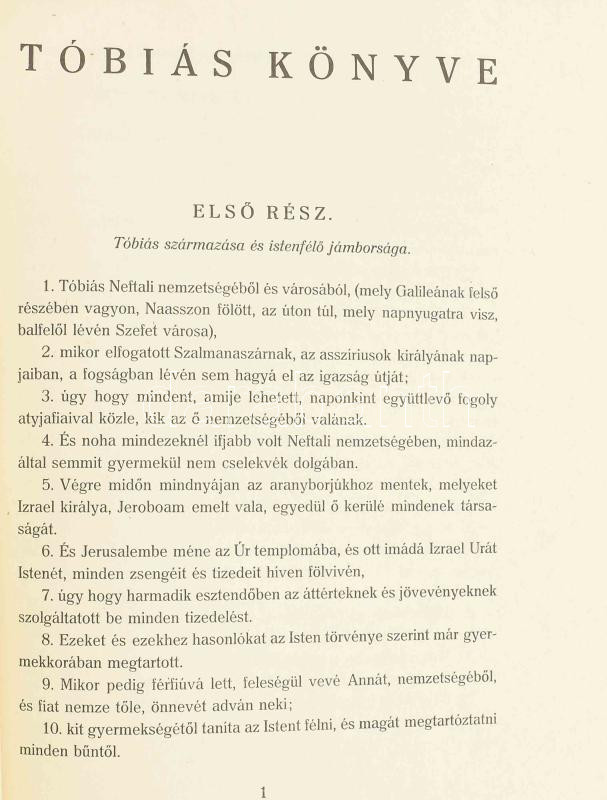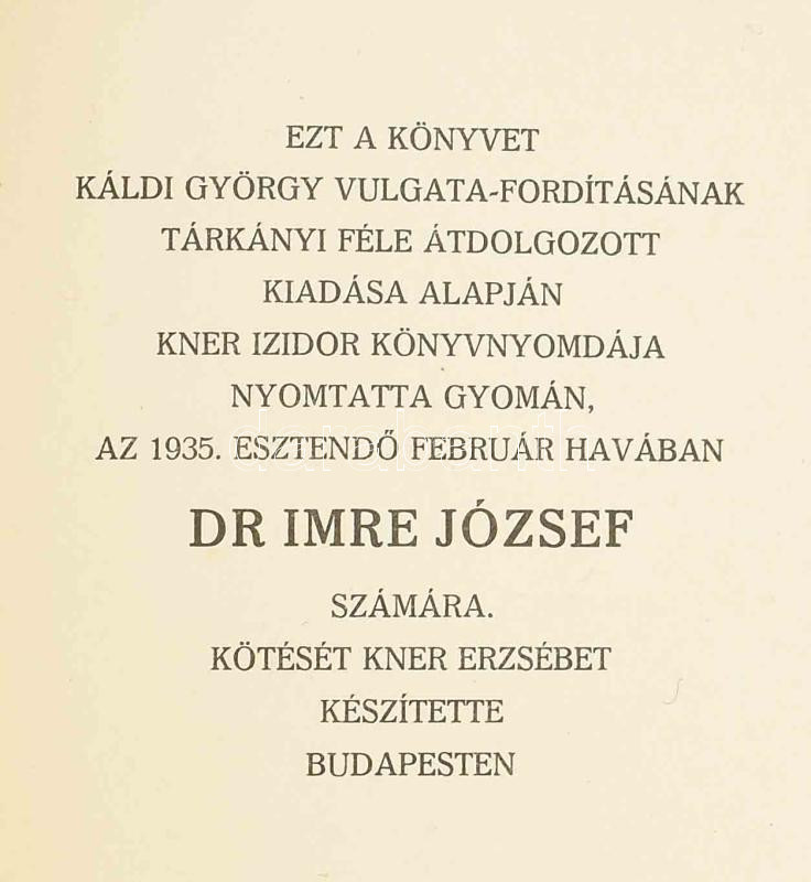Tóbiás könyve. (Gyoma, 1935, Kner Izidor-ny.), 2 sztl. lev.+ 23+(5) p. Egyetlen kiadás. Rendkívül ritka Kner-magánkiadású könyv, amely az idős Kner Izidor szembetegségét gyógyító Imre József (1884-1945) szemészorvos, egyetemi professzor részére készült, névre szólóan. ,,Ezt a könyvet Káldi György Vulgata-fordításának Tárkányi féle átdolgozott kiadása alapján Kner Izidor Könyvnyomdája nyomtatta Gyomán, az 1935. esztendő február havában Dr. Imre József számára. Kötését Kner Erzsébet készítette Budapesten." Kiadói félvászon-kötésben, a gerincet utólag piros színű papírral vonták be (ez némileg sérült), a lapok merített papíron. Gyűjtői ritkaság!