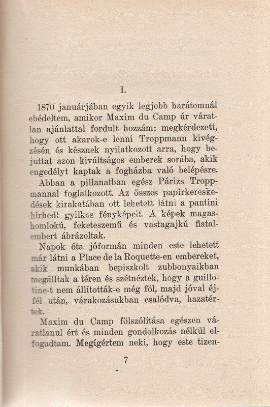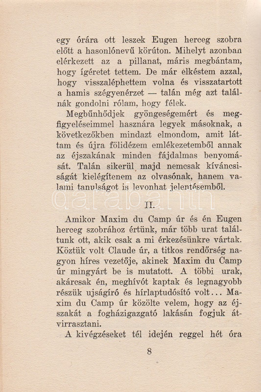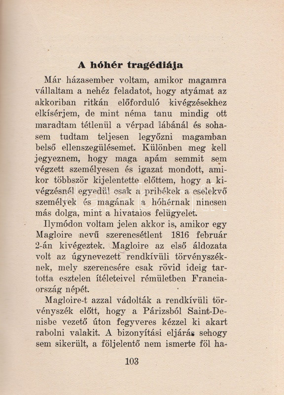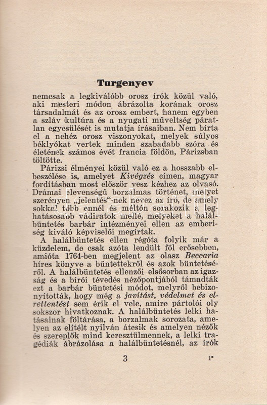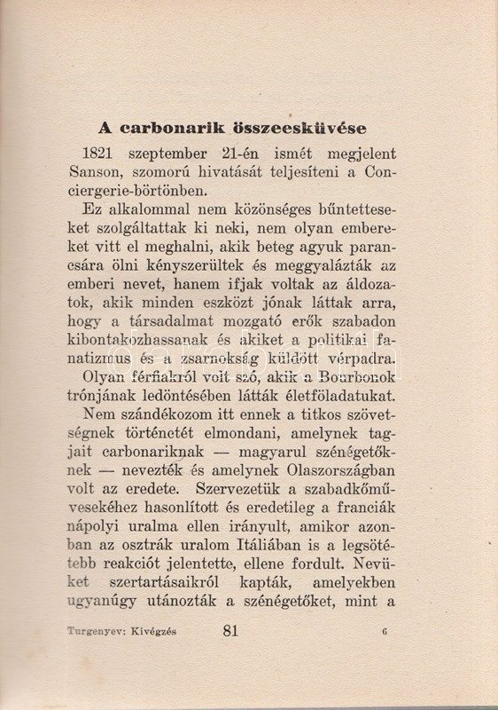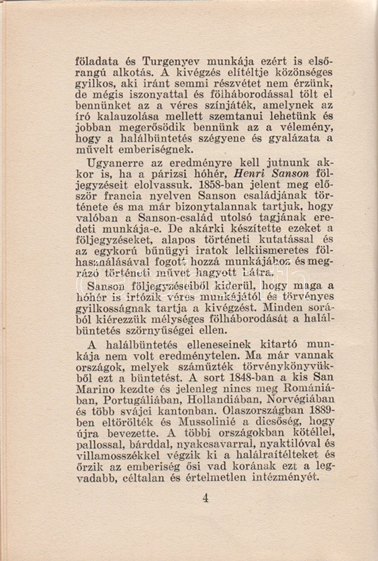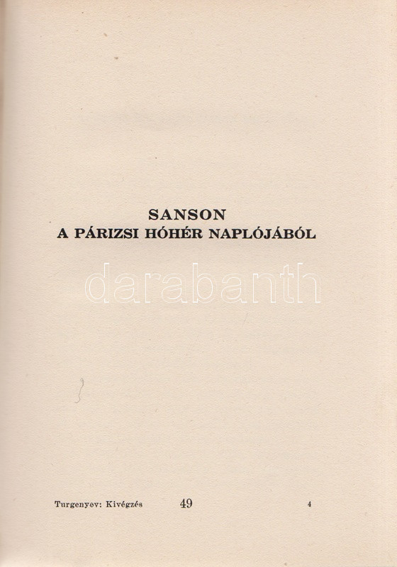 Turgenyev, Ivan Szergejevics: Kivégzés (Elbeszélés) - Sanson: A párizsi hóhér naplójából. Budapest, [1930]. Népszava-könyvkereskedés (Világosság Rt. ny.) 127 + [1] p. ElsÅ‘ magyar kiadás. A Népszava kettÅ‘s elbeszéléskötete az elÅ‘szó szerint elsÅ‘sorban a halálbüntetés eltörlése mellett érvel. Turgenyev elbeszélését a Henri-Charles Sanson XVIII. század végi párizsi hóhér nevéhez kötÅ‘dÅ‘ történet követi, melynek valódi szerzÅ‘je ismeretlen. A cÃmoldalon régi tulajdonosi bélyegzés. Poss.: Blanár László. [dr. Blanár László (1890-1952) Kolozsváron végzett orvos, Gyulán és környékén praktizált, egyes visszaemlékezések a szegények orvosaként, más visszaemlékezések a vörös Blanárként, megint más visszaemlékezések a szovjet hadsereget váró, de bennük és a rendszerben azonnal csalódó, meghasonlott emberként emlékeznek vissza rá.] Aranyozott kiadói egészvászon kötésben, a szÃnes, illusztrált elsÅ‘ borÃtó bekötve. Jó példány.
