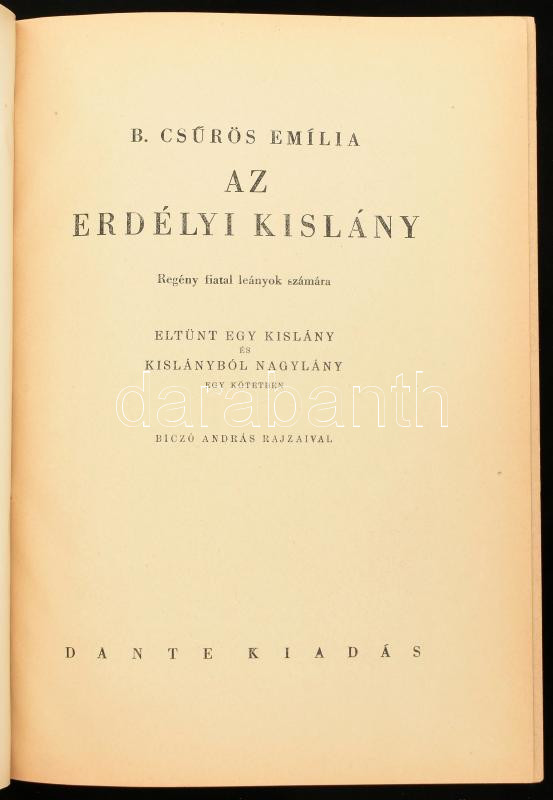 B. Csűrös Emilia: Az erdélyi kislány. Regény fiatal lányok számára. Eltűnt egy kislány és Kislányból nagylány egy kötetben. Bp.,1942,Dante. Biczó András rajzaival. Kiadói félvászon-kötés, foltos, kissé kopott borítóval.