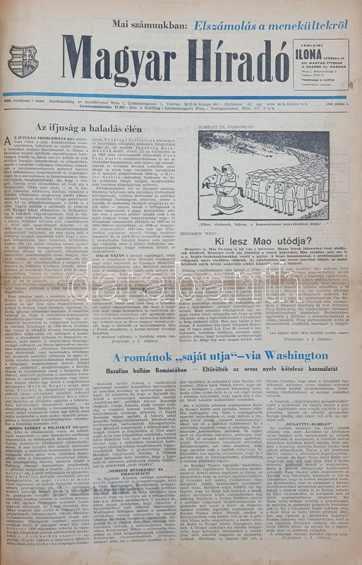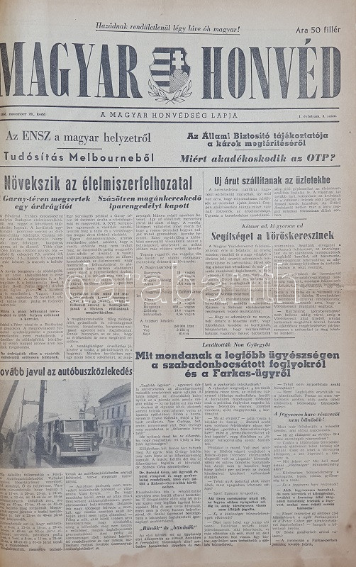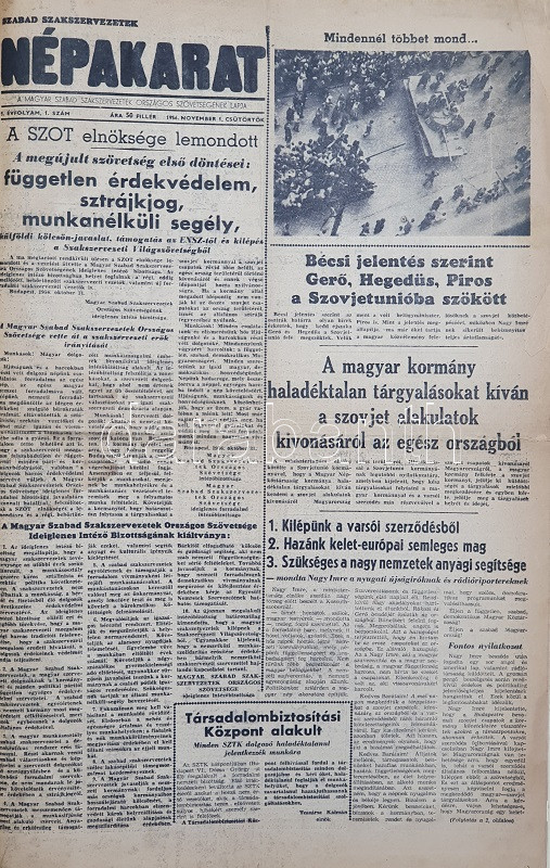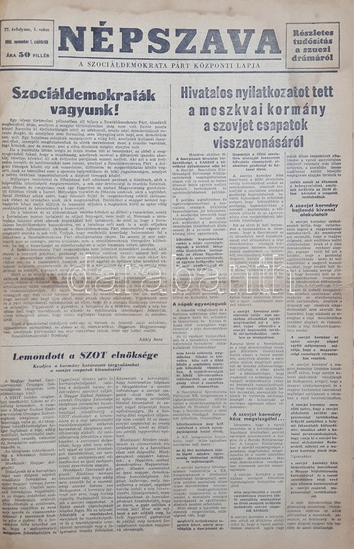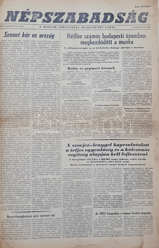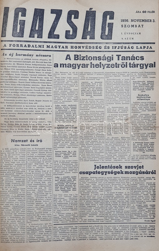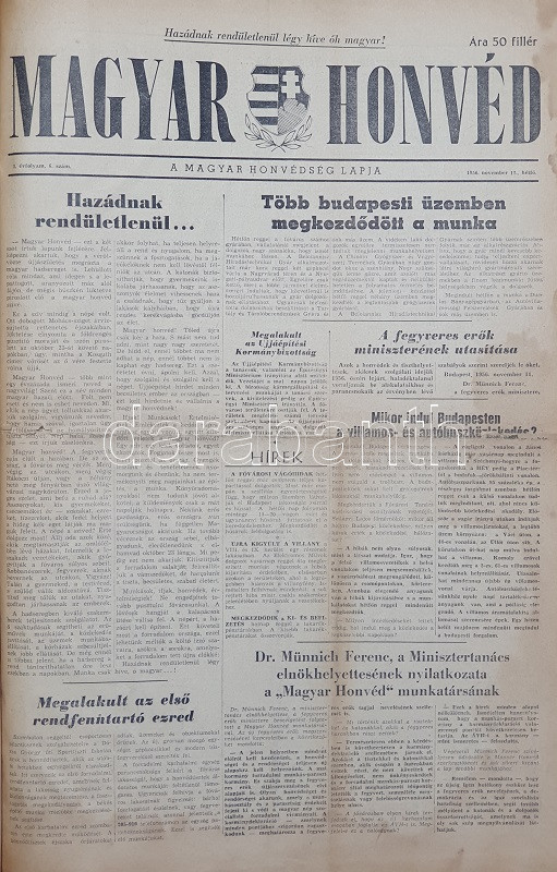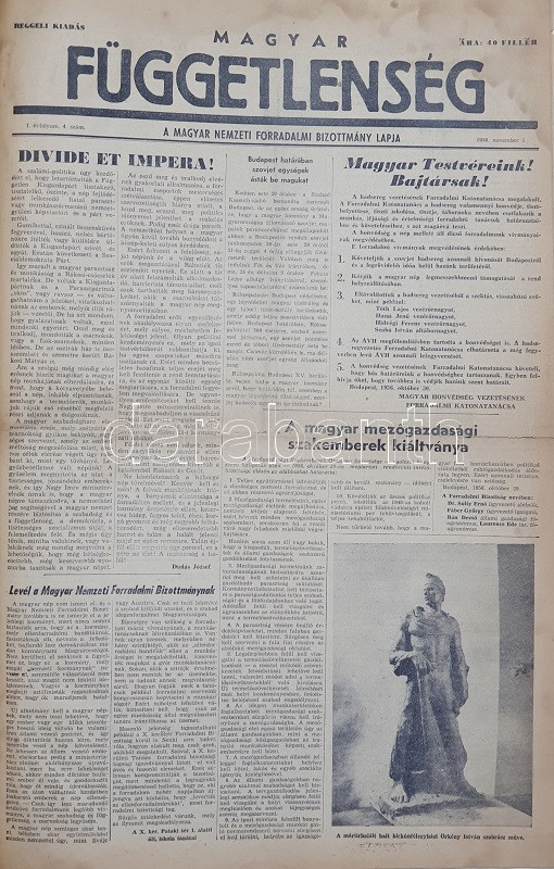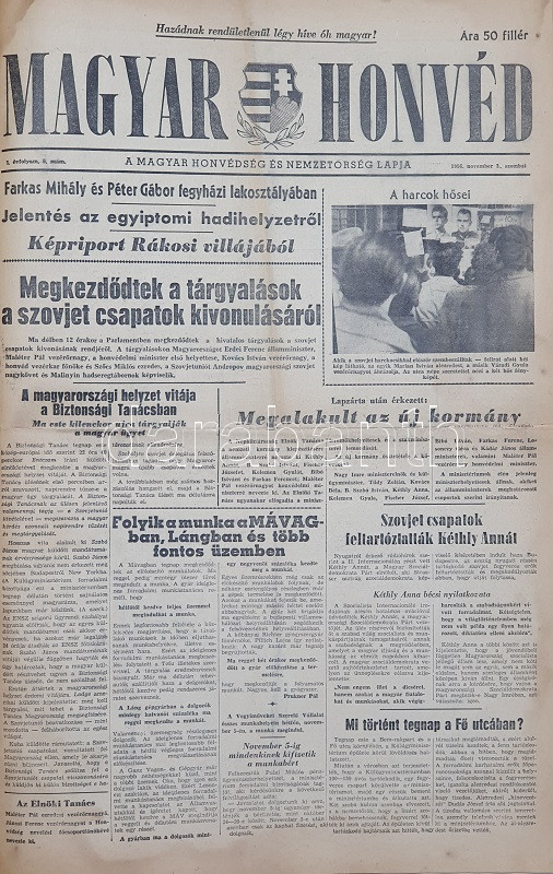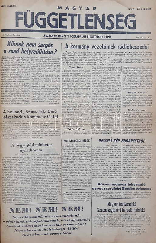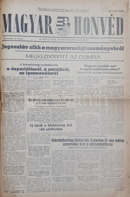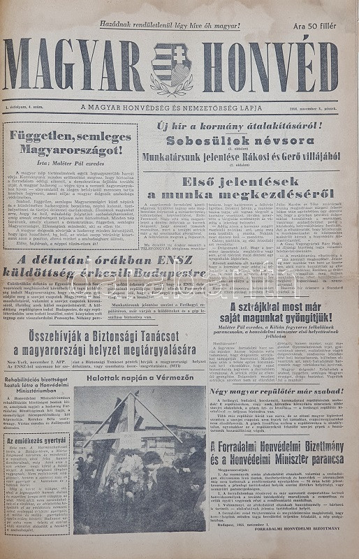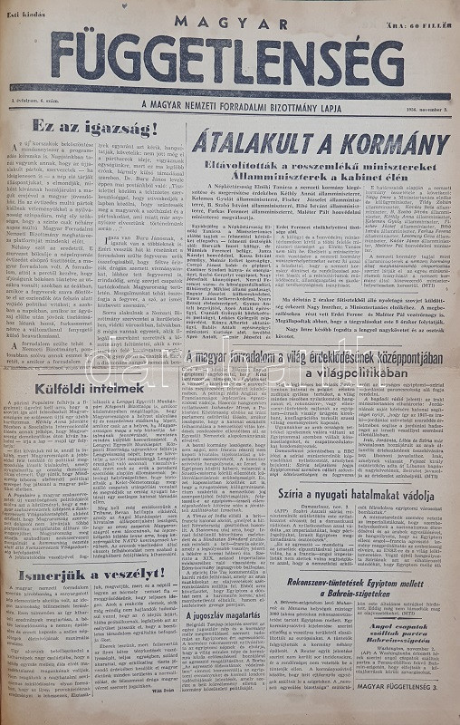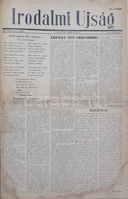 1956-os forradalmi, kollaboráns hírlapok és emigráns folyóiratok gyűjteménye [23 lapszám, egybekötve]. 1. A forradalmat megelőző időszakból származó lap: Esti Budapest. Az MDP budapesti pártbizottságának és Budapest Főváros Tanácsának lapja. Szerkeszti a szerkesztőbizottság. V. évfolyam, 234. szám. (1956. október 4.) Budapest, 1956. Szikra Lapnyomda. 6 p. Folio. -- 2. A forradalom lapszámai: Hétfői Hírlap. Független magyar lap. Felelős szerkesztő: Száva István. I. évfolyam, 4. szám. (1956. október 29.) Budapest, 1956. Athenaeum ny. 4 p. Folio. -- Magyar Nemzet. Független politikai napilap. Szerkeszti a szerkesztőbizottság. XIX. évfolyam, 257. szám. (1956. november 3.) Budapest, 1956. Athenaeum ny. 4 p. Folio. -- Magyar Honvéd. A Magyar Honvédség és Nemzetőrség lapja. Felelős szerkesztő: Zsolt Róbert. I. évfolyam, 4., 5. szám (1956. november 2. - 1956. november 3.) Budapest, 1956. Október 23. ny. 4 p.; 4 p.; Folio. -- Magyar Honvéd. A Magyar Honvédség lapja. I. évfolyam, 6,, 8., 10. és 11. szám. (1956. november 12. - 1956. november 23.) Budapest, 1956. Október 23. ny. 4 p.; 4 p.; 4 p., 4. Folio. -- Irodalmi Ujság. A Magyar Írók Szövetségének lapja. Megjelenik szombaton. Felelős szerkesztő: Hámos György. VII. évfolyam, 43. szám. (1956. november 2.) Budapest, 1956. Athenaeum ny. 4 p. Folio. -- Népszava. A Magyar Szakszervezetek központi lapja. Szerkeszti a szerkesztőbizottság. 84. évfolyam, 253. szám. (1956. október 26.) Budapest, 1956. Athenaeum ny. 2 p. Folio. -- Népszava. A Magyar Szociáldemokrata Párt központi lapja. Főszerkesztő: Kéthly Anna. 77. évfolyam, 1., 3. szám. (1956. november 1., 3.) Budapest, 1956. Athenaeum ny. 4 p.; 4 p. Folio. -- Igazság. A forradalmi magyar honvédség és ifjúság lapja. Felelős szerkesztő: Obersovszky Gyula. I. évfolyam, 9. szám. (1956. november 3.) Budapest, 1956. Athenaeum ny. 4 p. Folio. -- Magyar Függetlenség. A Magyar Nemzeti Forradalmi Bizottmány lapja. Felelős szerkesztő: Dudás József. I. évfolyam, 3., 4., 6. szám. (1956. október 31. - 1956. november 3.) Budapest, 1956. Ny. n. 4 p.; 4 p.; 4 p. Folio. -- Népakarat. A Magyar Szabad Szakszervezetek Országos Szövetségének lapja. Szerkeszti a szerkesztőbizottság. I. évfolyam, 1. szám. (1956. november 1.) Budapest, 1956. Athenaeum Ny. 4 p. Folio. -- 3. Kollaboráns hírlap lapszáma: Népszabadság. A Magyar Szocialista Munkáspárt lapja. I. évfolyam, 13. szám. (1956. november 20.) Budapest, 1956. Budapesti Lapnyomda. 4 p. Folio. -- 4. A nyugati magyar emigráció által alapított folyóiratok lapszámai: Nemzetőr. A Magyar Szabadságharcos Világszövetség lapja. Felelős szerkesztő: Kecskési-Tollas Tibor. Megjelenik kéthetenkint. VII. évfolyam, 127. szám. (1962. június 1.) München, 1962. Ny. n. 8 p. Folio. -- Uj Hungária. Szabad magyarok független hetilapja. Felelős szerkesztő: Herp János. Megjelenik pénteken. X. évfolyam, 22. szám. (1962. június 1.) München, 1962. Herp János ny. 8 p. Folio. -- Magyar Híradó. Független hetilap. Felelős szerkesztő: Vasváry Edith. VI. évfolyam, 22. szám, VIII. évfolyam, 7. szám. (1962. június 2., 1964. július 1.) [Bécs] Wien, 1962-1964. Bécsi Magyar Hírlapírók Köre. Fritz Molten Grossdruckerei und Verlag. 6 p.; 10 p. Folio. Folyóirat-gyűjteményünk az 1956-os forradalom eseményeiről számol be, döntően szabadságharcos látószögből, a Népszabadság esetében a felálló új rezsim történelemhamisításának szemszögéből. A gyűjtemény 1956-os fókuszát némileg tágítja a három emigráns lap, melyek az 1960-as évek első felében latolgatják a kommunizmus elhalásának esélyét, azzal a tanulsággal, hogy a fiatalság 1956-ot követően nem fogékony a radikális baloldal társadalomelméletére. Néhány, a forradalomban alapított lap még november második felében is megjelenik, így például a fejlécében Kossuth-címert őrző Magyar Honvéd kitart még néhány szám erejéig, és a megjelentető nyomda nevében is őrzi a forradalmi örökséget. Gyűjteményünk emlékezetes darabja az Irodalmi Ujság 1956. november 2-i lapszáma, amelyben megjelenik Illyés Gyula ,,Egy mondat a zsarnokságról" című költeménye, Németh László vezércikke, Szabó Lőrinc, Déry Tibor és mások írásai mellett. Úgyszintén emlékezetes a forradalmi időszak alatt megjelenő Népszava politikai napilap fejléce, november 1-jétől a lap ugyanis a Szociáldemokrata Párt napilapja, főszerkesztőjeként Kéthly Anna. Természetesen novemberben valamennyi forradalmi napilap a betiltás sorsára jut. A Magyar Honvéd, a Népszabadság, illetve az emigráns lapok oldalain szövegközti fényképek, grafikák. Egy folyóiratszám duplán szerepel. Több folyóiratszám a hajtásnál kettéhasadt, néhány levél szélén apró hiány, néhány oldal enyhe foltosság. Korabeli fél-műbőr kötésben.