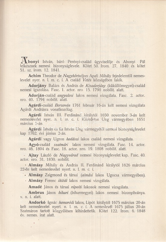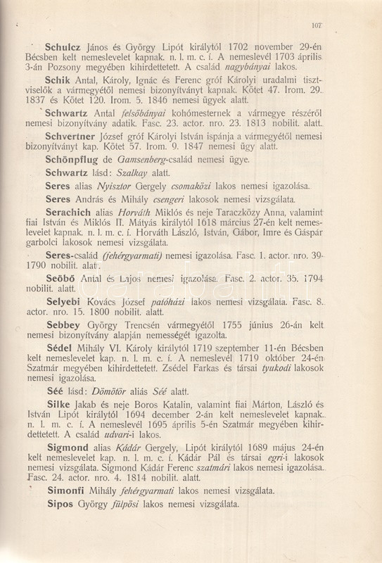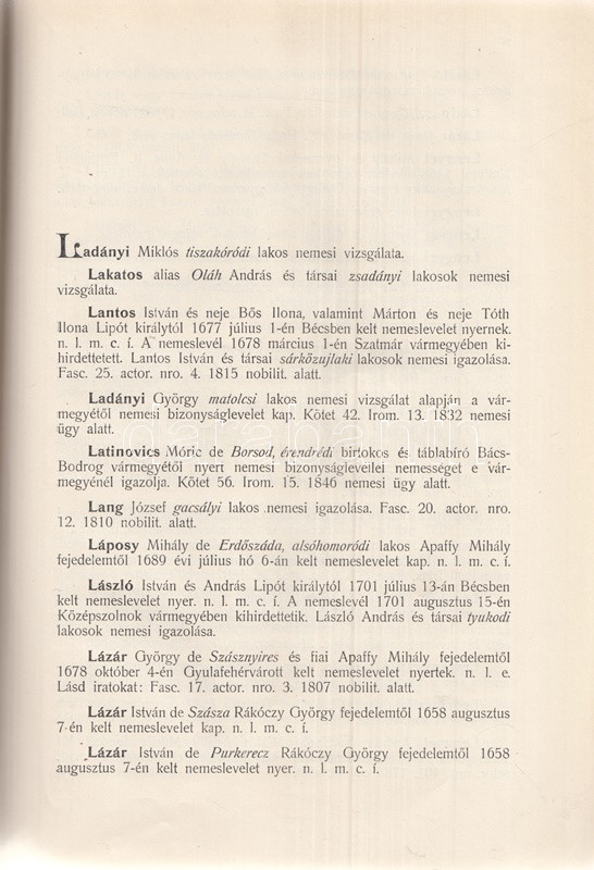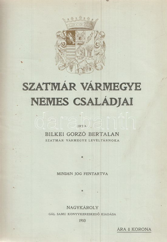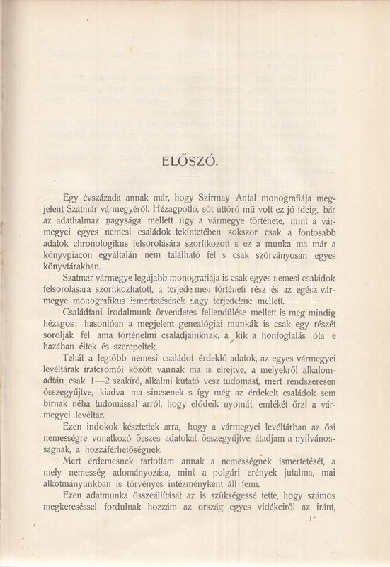 Szatmár vármegye levéltárosának munkája a vármegye nemes családjait lajstromozza a megyei levéltárban található iratok, adatolt nemességi vizsgálatok alapján. Az előszó szerint a szatmári nemesi családok családtörténeti részletek nélküli puszta listázása is hiánypótló munka, hiszen ilyen formában az adatok csakis a levéltár mélyén bújnak meg, korábban nem tették közzé. A műhöz két évvel később pótkötet jelent meg. A címoldal verzóján és a belív egy oldalán régi tulajdonosi bélyegzés.