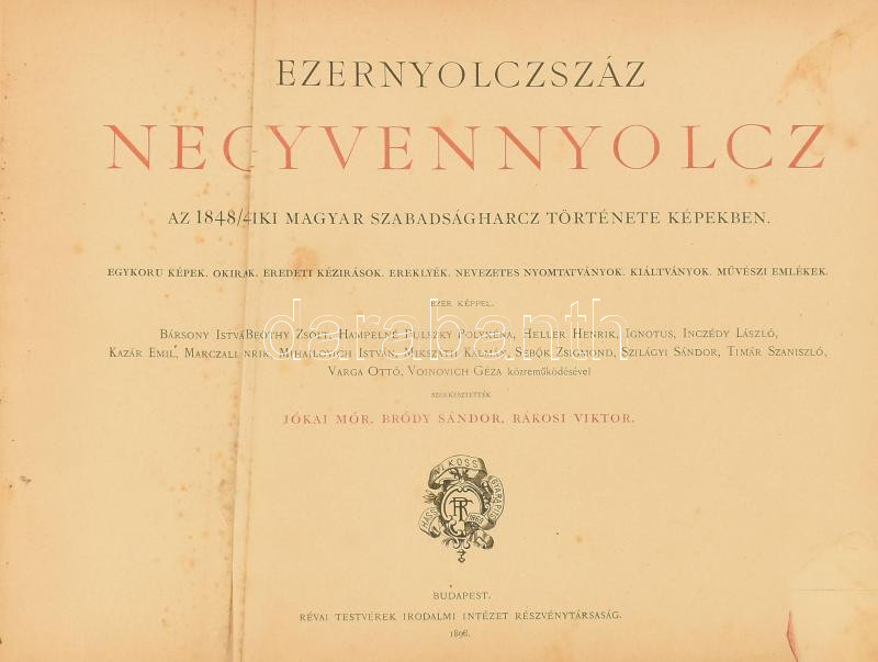 Ezernyolczszáz negyvennyolcz. Az 1848/49-iki magyar szabadságharcz története képekben. Egykorú képek, okiratok, eredeti kézírások, ereklyék, nevezetes nyomtatványok, kiáltványok, művészi emlékek. Ezer képpel. Szerk.: Jókai Mór, Bródy Sándor, Rákosi Viktor. Bp., 1898, Révai (Franklin-ny.), 476 p. Rendkívül gazdag szövegközti és egészoldalas képanyaggal illusztrálva. Átkötött, harántalakú egészvászon-kötésben, kissé viseltes, sérült borítóval, sérült, kissé hiányos címlappal, helyenként foltos lapokkal.