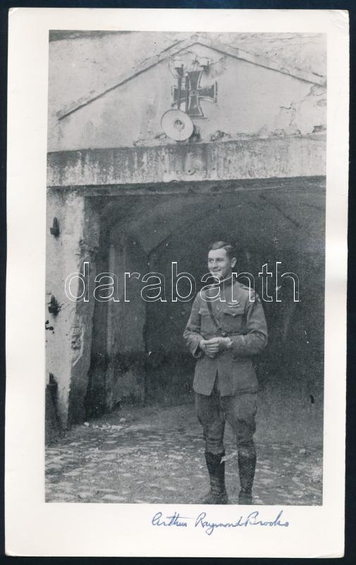 Arthur Raymond Brooks (1895-1991) amerikai I. világháborús pilóta, repülő ász autográf aláírása őt ábrázoló képen (későbbi előhívás), 20x12,5 cm / Autograph signature of Arthur Raymond Brooks (1895-1991) American WWI pilot, flying ace, on a photo (later copy), 20x12.5 cm