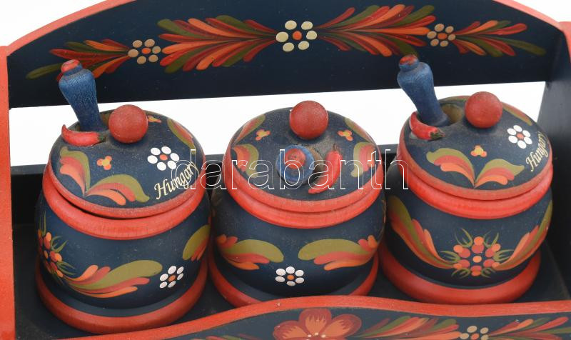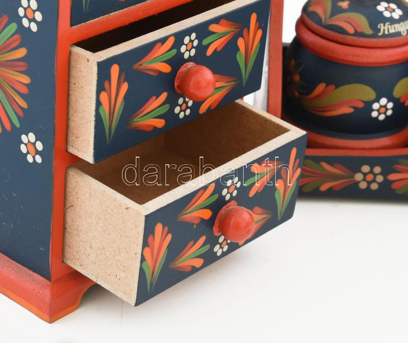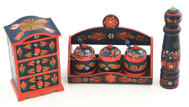 Leírás: 3 darab festett népi tárgy, ékszertartó szekrényke, borsdaráló, fűszeres szett