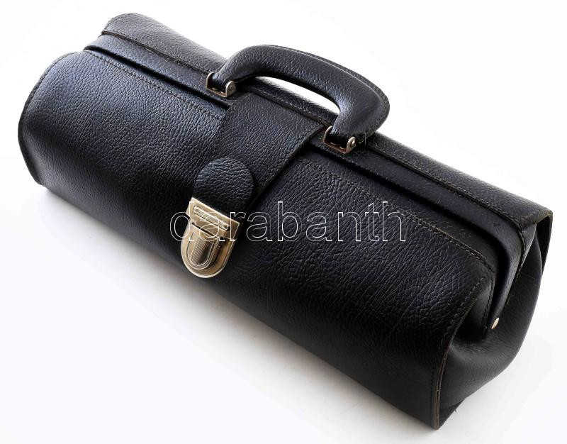 Leírás: Régi műbőr orvosi táska 40 cm benne régi patika és egyéb üvegek