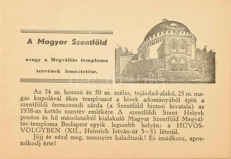 1943 A Magyar Szentföld, avagy a Megváltás temploma tervének ismertetése. (A hűvösvölgyi Henrich István út 5. szám alá tervezett, végül befejezetlenül maradt Magyar Szentföld Megváltás temploma ismertetÅ‘ prospektusa). FelelÅ‘s kiadó: P. Majsai Mór O. F. M. szentföldi biztos. Bp., Kerbolt Béla-ny., (32) p. Kiadói tűzött papÃrkötés, a lapok szélén helyenként körbevágásból eredÅ‘ hiánnyal.