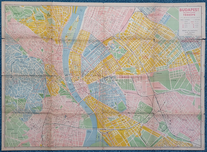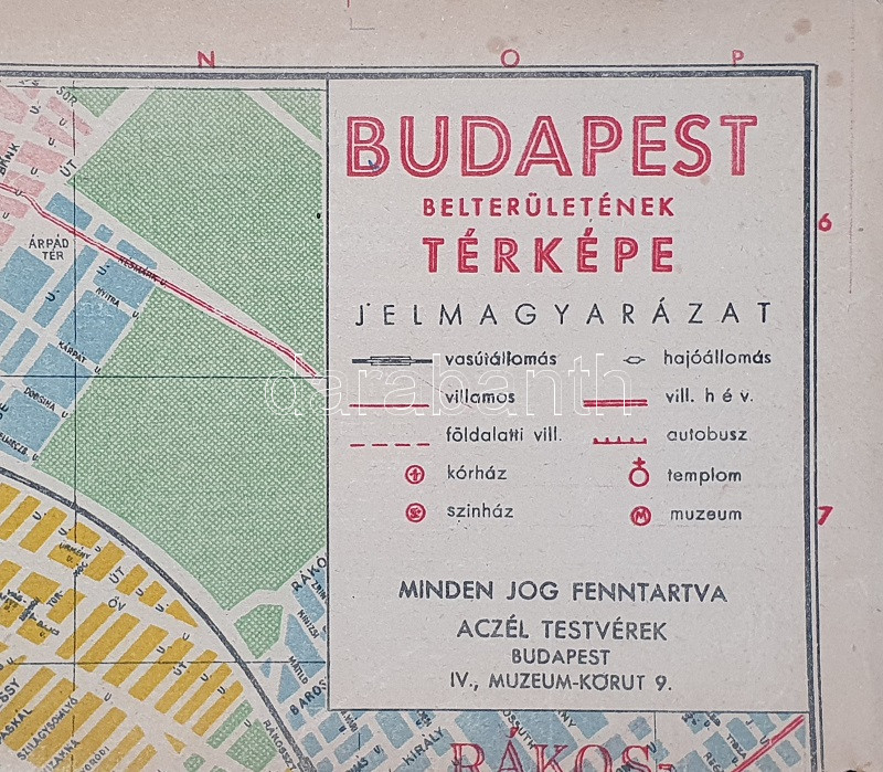 Budapest belterületének térképe utcanévjegyzékkel, Horthy Miklós körtérrel, Mónus Illés rakparttal és Marx Károly térrel (1938/1948). Budapest, 1938 [1948]. Aczél Testvérek - Közlekedési Nyomda Kft. Színes térkép, mérete 475x660 mm egy 495x685 mm méretű térképlapon. Színes térképünk igen izgalmas dokumentum a koalíciós idők végéről. A XIV kerületre osztott Budapest térképének hátoldalán utcanévjegyzék, a feltüntetett téves évszámjelölés szerint az utcanévjegyzék frissítése 1938 márciusában zárult le. Ez nyilvánvaló tévedés. A térképoldalon egyszerre jelennek meg a Horthy-korszakból ismerős topográfiai nevek: Horthy Miklós híd [ma: Petőfi híd], Horthy Miklós körtér [Móricz Zsigmond körtér], Horthy Miklós út [Bartók Béla út], illetve a XIII. kerület városrészi megnevezése Horthy Miklósné Purgly Magdolna után Magdolnaváros (a későbbi Angyalföld helyett). A térképen a tágabb értelemben vett Belváros valamennyi hídja áll a Horthy Miklós hídtól a Margit hídig, az Árpád híd csak tervezetében jelölve. A körutak eredeti nevüket viselik (Erzsébet körút, Margit körút), de mindenképpen feltűnő a Nyugati pályaudvar terének Marx tér (!) néven való megnevezése, a Margit körút Mártírok útjára, a Károly körút Somogyi Béla útra, a Kiskörút Lánchídhoz vezető szakaszának József Attila utcára, a budai rakpart egy részének Mónus Illés rakpart névre való átkeresztelése. A kerületek különböző színnel jelölve, a vasúti, villamos- autóbusz- és HÉV-hálózat feltüntetve, a kórházak, színházak, a múzeumok és a keresztény templomok kiemelve. Mindent összevéve úgy gondoljuk, hogy kuriózumszámba menő térképünk a várost és közlekedési hálózatát valóban 1938. évi állapotában ábrázolja, de az 1945. évi utcanév-átnevezések közül a szerkesztő által legfontosabbnak vélteket már a térképoldalon is feltüntették - az Erzsébet tér Sztálin térre való átnevezését (1946) viszont a térkép nem látszik tudomásul venni. A hátoldalon az utcanévjegyzék lezárásának évszáma kézzel javítva. Fabó-Holló 3319. Jó állapotú térkép, a hajtások mentén apró szakadásnyomokkal.