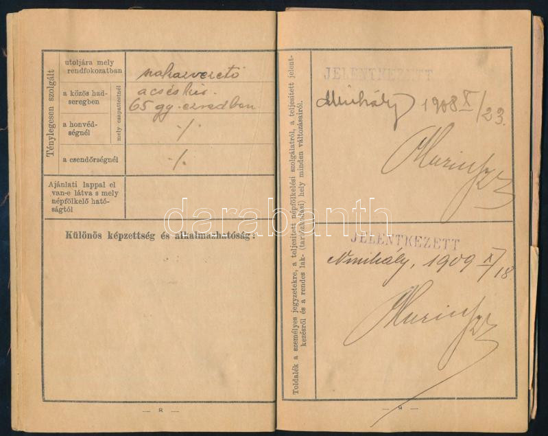 1908-1909 Népfölkelési igazolvány, M. kir. sátoraljaújhelyi 33. népföl...