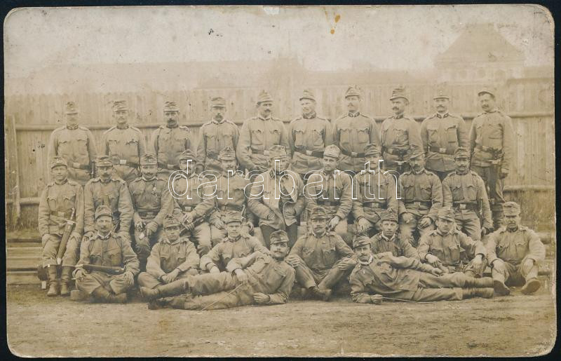 Leírás: cca 1918 Katonai (utász) csoportkép, többük kezében utászkard látható, fotólap, megírva, bélyegzéssel, 13,5x8,5 cm