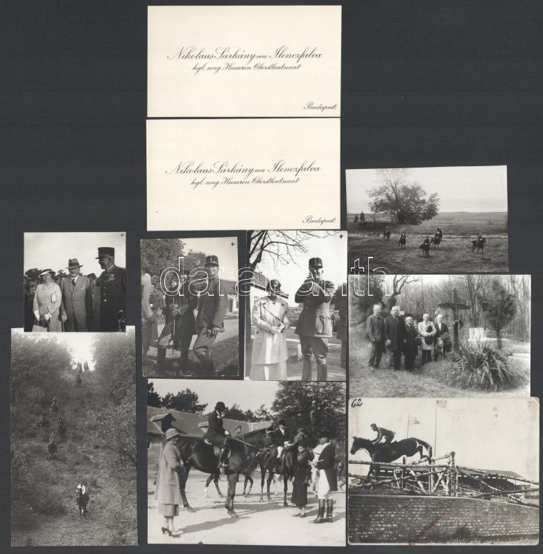 cca 1930-1979 Huszár témájú fotók: Kayser Vilmos huszárezredes, Issekutz Lajos alezredes, lovaglás képei, Kayser Vilmos (1979), stb.; össz. 8 db, változó méretben és állapotban + ilenczfalvi Sárkány Miklós (1884-?) nyug. huszárezredes (a cs. és kir. 8. huszárezredben szolgált az I. világháborúban) 2 db névjegykártyája