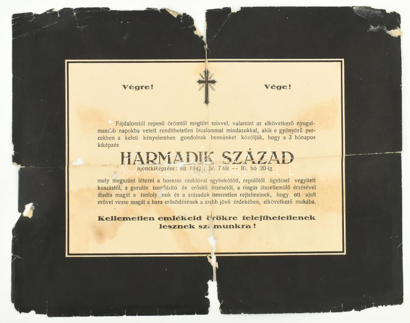 Leírás: cca 1942 Újvidék, repülőtér, a kaposvári 3-as SAS repülős felderítőszázad tréfás, kiképzést búcsúztató gyászjelentése, sérült