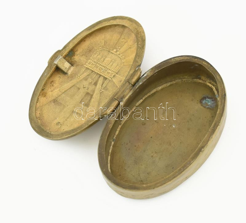 Leírás: Szandrik korona díszítéses réz szelence, jelzett, 5x3,5 cm