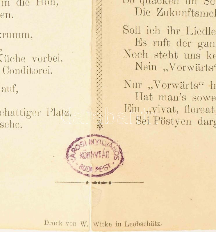 1893 Weinberger, Rudi: Pöstyen. Német nyelvű vers Pöstyén (Piešťany) felvidéki fürdővárosról. Leobschütz (Głubczyce), W. Witke-ny. Kissé sérült, javított, intézményi bélyegzővel, 39,5x25 cm