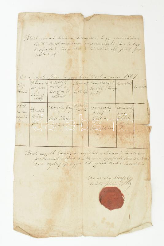 Leírás: 1849 Bozók (Bzovík), Felvidék, keresztlevél, Nemzethy József plébános aláírásával és viaszpecsétjével