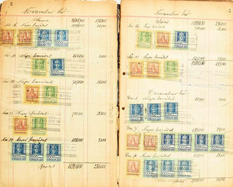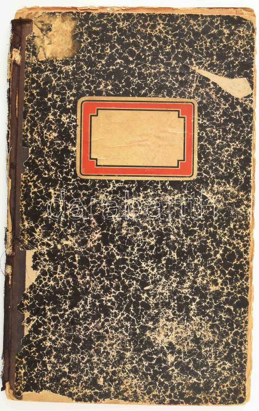 Leírás: 1927-1929 Hódmezővásárhely, özv. Kovalik Istvánné adókönyve, 21 oldalnyi (koronás, ill. pengős) forgalmi adóbélyeggel; utána kb. 20 oldalnyi ceruzás feljegyzéssel (orosz nyelvtanulás jegyzetei). Sérült félvászon-kötésben.