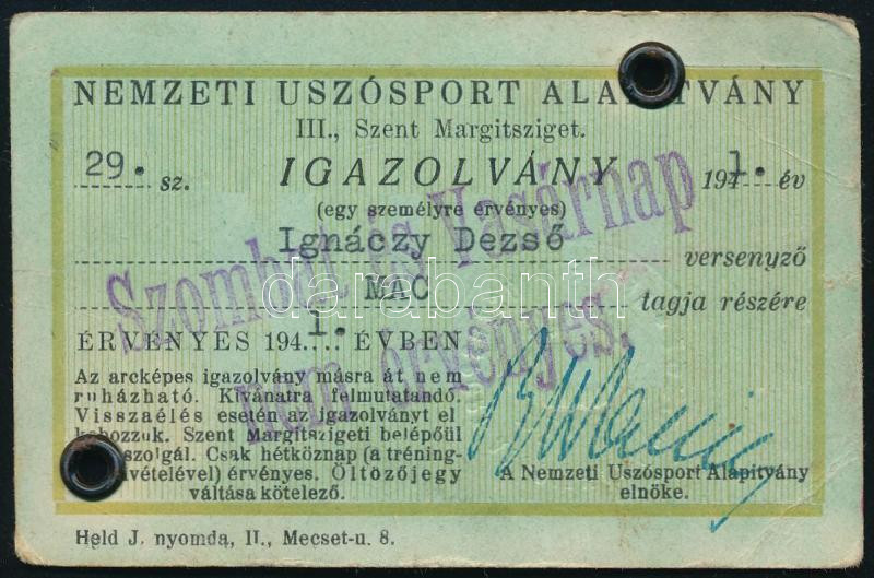 1941 Úszósport igazolvány MAC versenyző részére a Margitszigetre, fény... https://www.darabanth.com/hu/464-Gyorsarveres/464.0/Mutargy-papirregiseg-egyeb/Okmanyok~1000020/1941-Uszosport-igazolvany-MAC-versenyzo-reszere-a-Margitszigetre-fenykeppel~II3127992