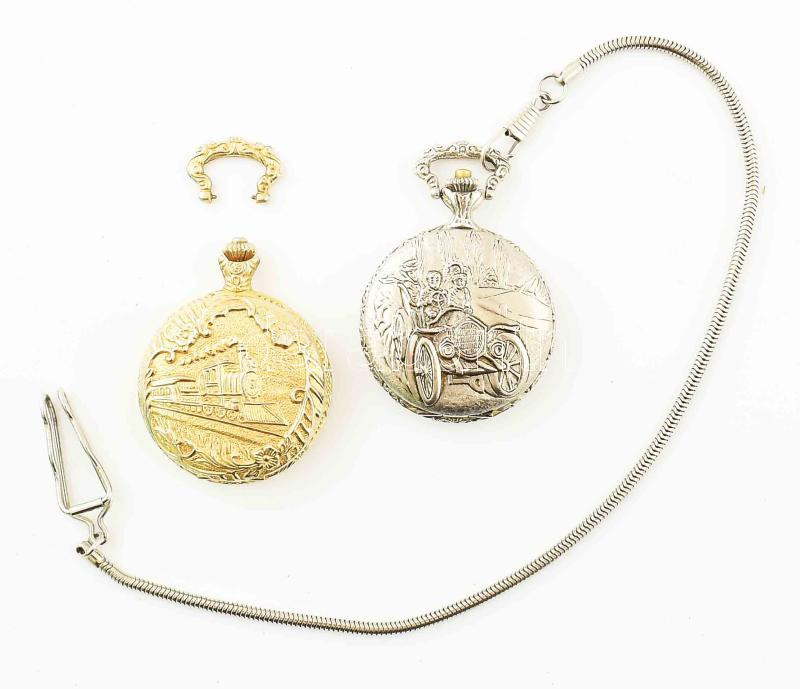 Leírás: 2 db modern kézi felhúzós zsebóra, jó állapotban, működnek, lánccal.