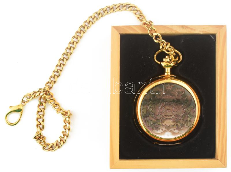 Leírás: Helvetia quartz zsebóra gyöngyház berakással, nem jár, eredeti dobozában, szép állapotban, d: 5,5 cm