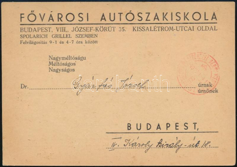 Leírás: 1940 A Fővárosi Autósiskola reklámlapja, orvosok részére indítandó kedvezményes tanfolyamról, postán elküldve, jó állapotban